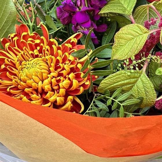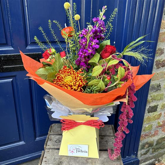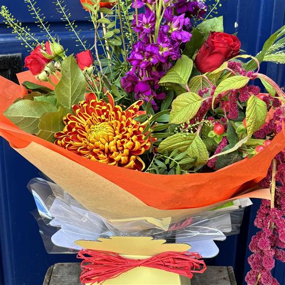 A rich seasonal mix bursting with deep reds, fiery orange, and vibrant purples. This bold hand-tied bouquet celebrates autumn’s warmth with texture, colour, and natural character.