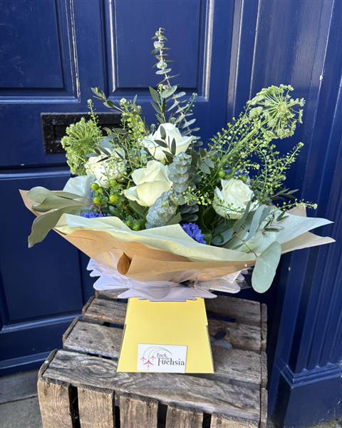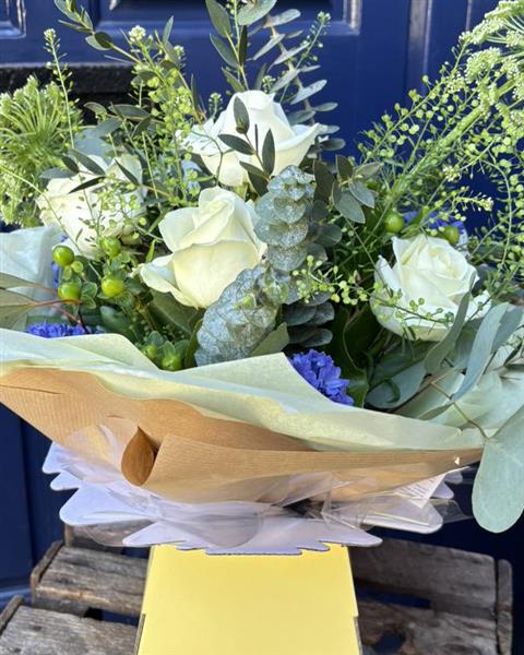A cool and elegant bouquet of soft white roses, green foliage, and hints of blue, arranged in a natural hand-tied style with fresh, seasonal stems for a refined coastal feel.