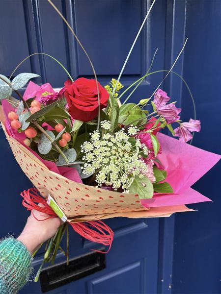 Featuring a single red velvet rose at the centre of a colourful floral display!