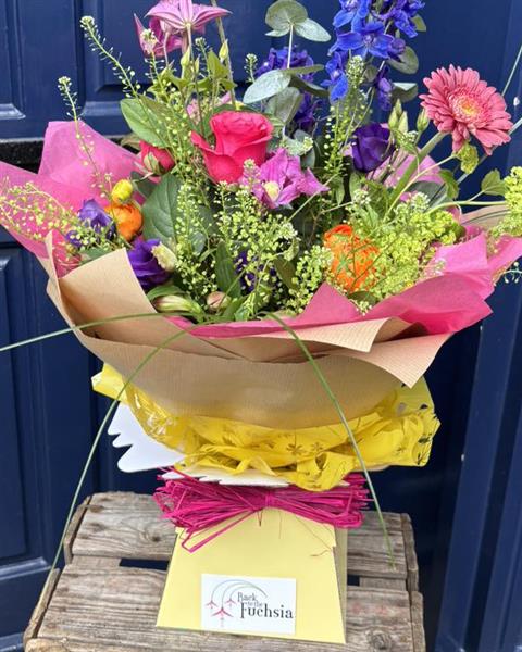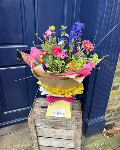 A vibrant mix of bold blooms in hot pink, orange, blue, and yellow, hand-tied with natural greenery for a joyful burst of colour and fresh seasonal energy.